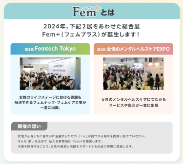 Fem+ ~女性の健康と活躍を支援する展示会~ 会期:2024年10月17日(木)~19(土)会場:東京ビッグサイト